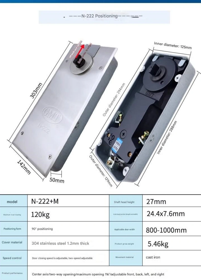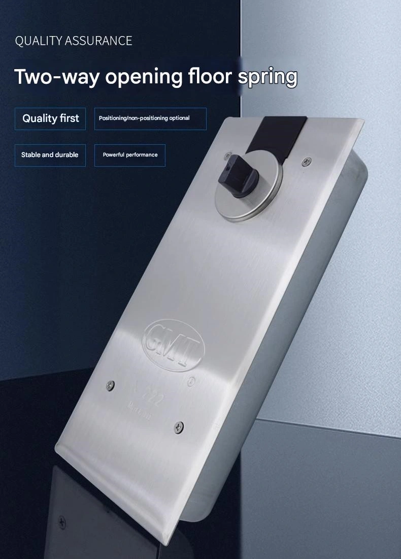 - 可调定位,满足场景需求 多数地板弹簧支持“定位功能”调节,可设置为“90°定位”(门开至90°时保持固定,便于货物搬运与轮椅通行)或“无定位”(门开后立即自动闭合)。这适应了不同使用场景(如商场入口需频繁搬运货物时采用90°定位,办公室门需常闭时采用无定位)。